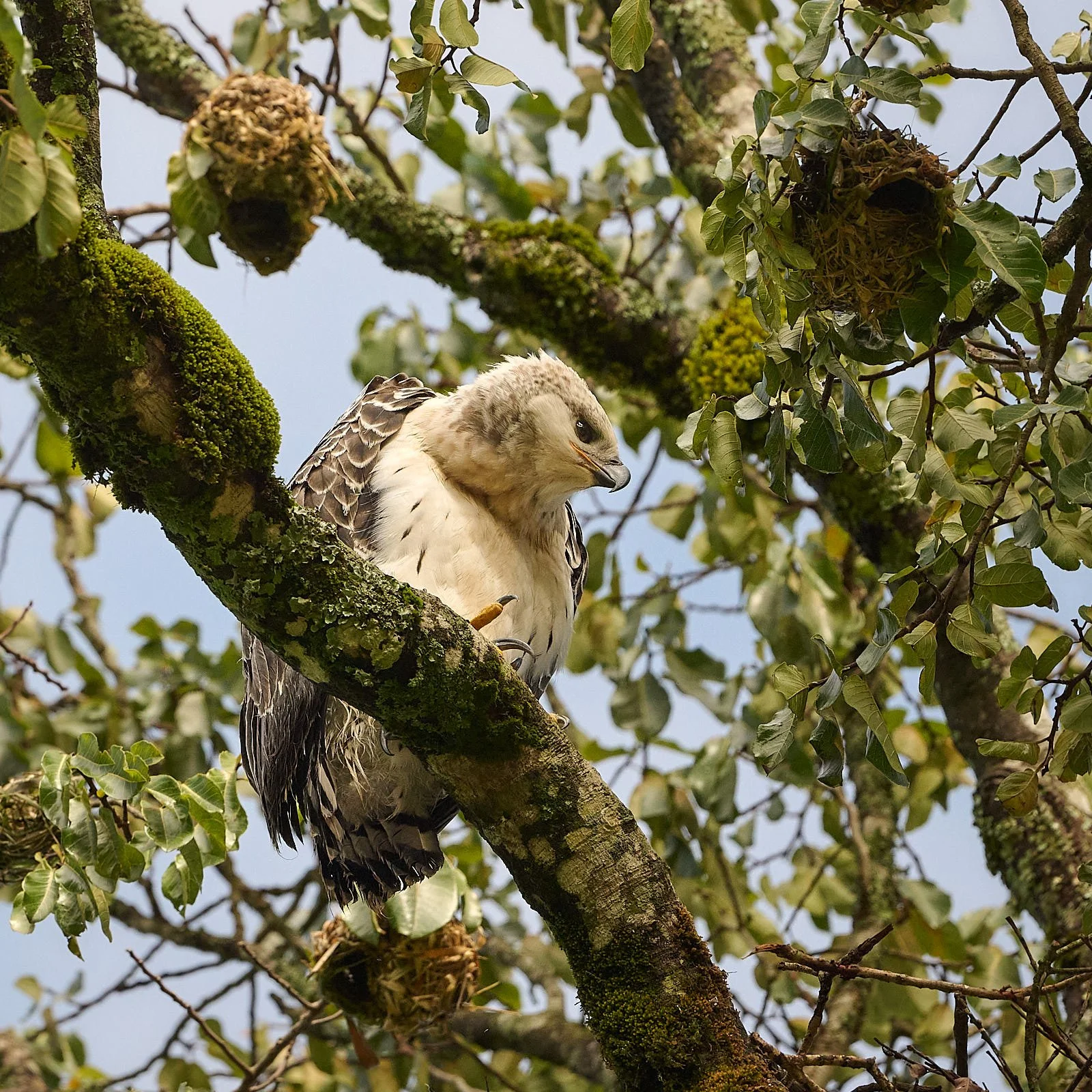 Here is the occupant, a juvenile that is too young to fly. The nests around the chick belong to Vieillot’s Black Weavers, who are known to breed in proximity to other species’ nests.