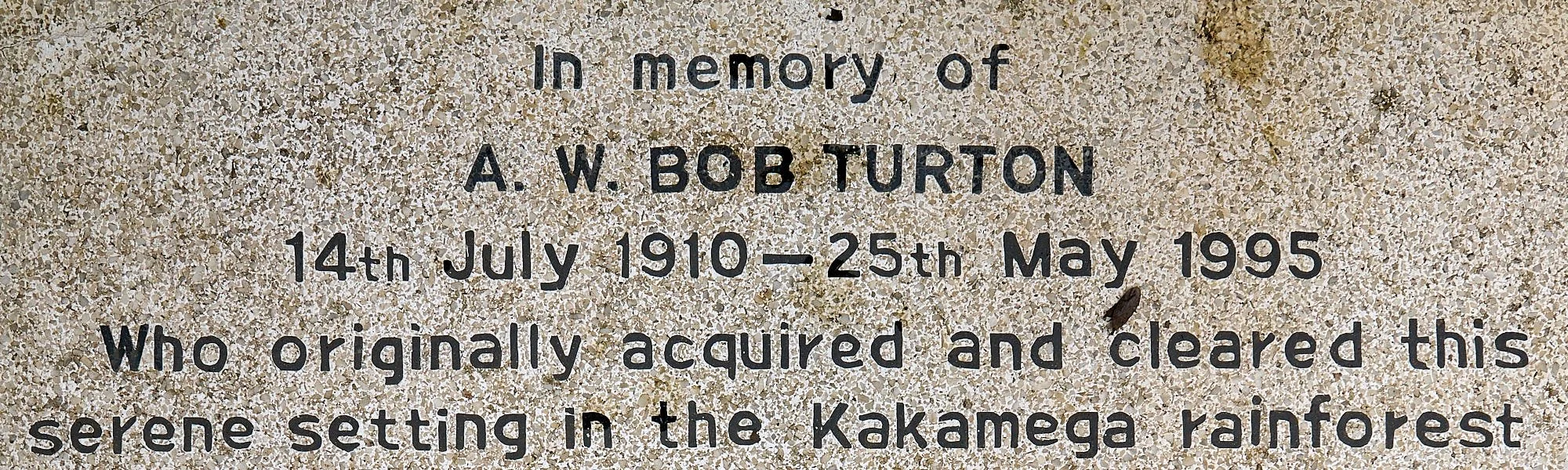 Bob Turton, from South Africa, came to Kenya to seek his fortune in the Kakamega Gold Rush. When that did not “pan out” he turned to timber, running a sawmill, but practicing the sustainable forest policy of the colonial era. One day the sawmill received an order for an Elgon Olive (teak). Bob was informed by his workers of an especially fine specimen in the forest nearby. His wife (Anita), on seeing the tree, declared that it should not be cut down, rather that she must have her house built facing it. Bob did just that and made a home and garden for themselves, deep in the forest. Anita, a keen gardener, laid out a magnificent garden, beneath an overarching cathedral of trees, with the help of an army of gardeners. They were married for 25 years when sadly she died.