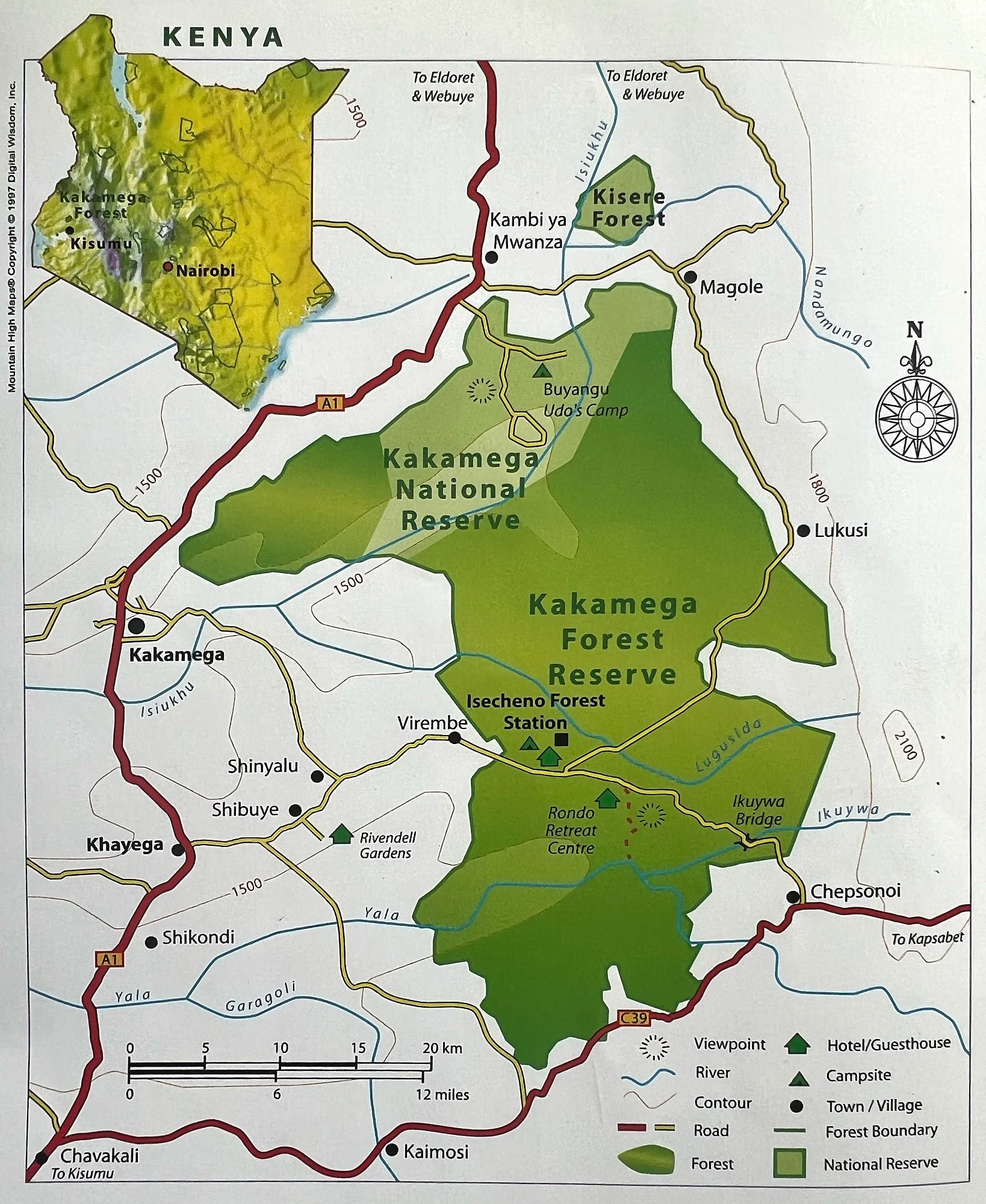 The journey to Kakamega forest took about 8 hours. It was fascinating to reach the edge of the Great African Rift and descend into it. Also, to see the transition from urban to rural habitation. The long rains had started and the countryside looked so lush. It was encouraging to find the village roads lined with well-stocked food stalls. Our route took us northwest past volcanic Longonot and Londiani peaks, Rift Lakes Naivasha, Elmentieta and Nakuru, and then west by the town of Kapsabet. The final section into the forest was slick, red mud.
