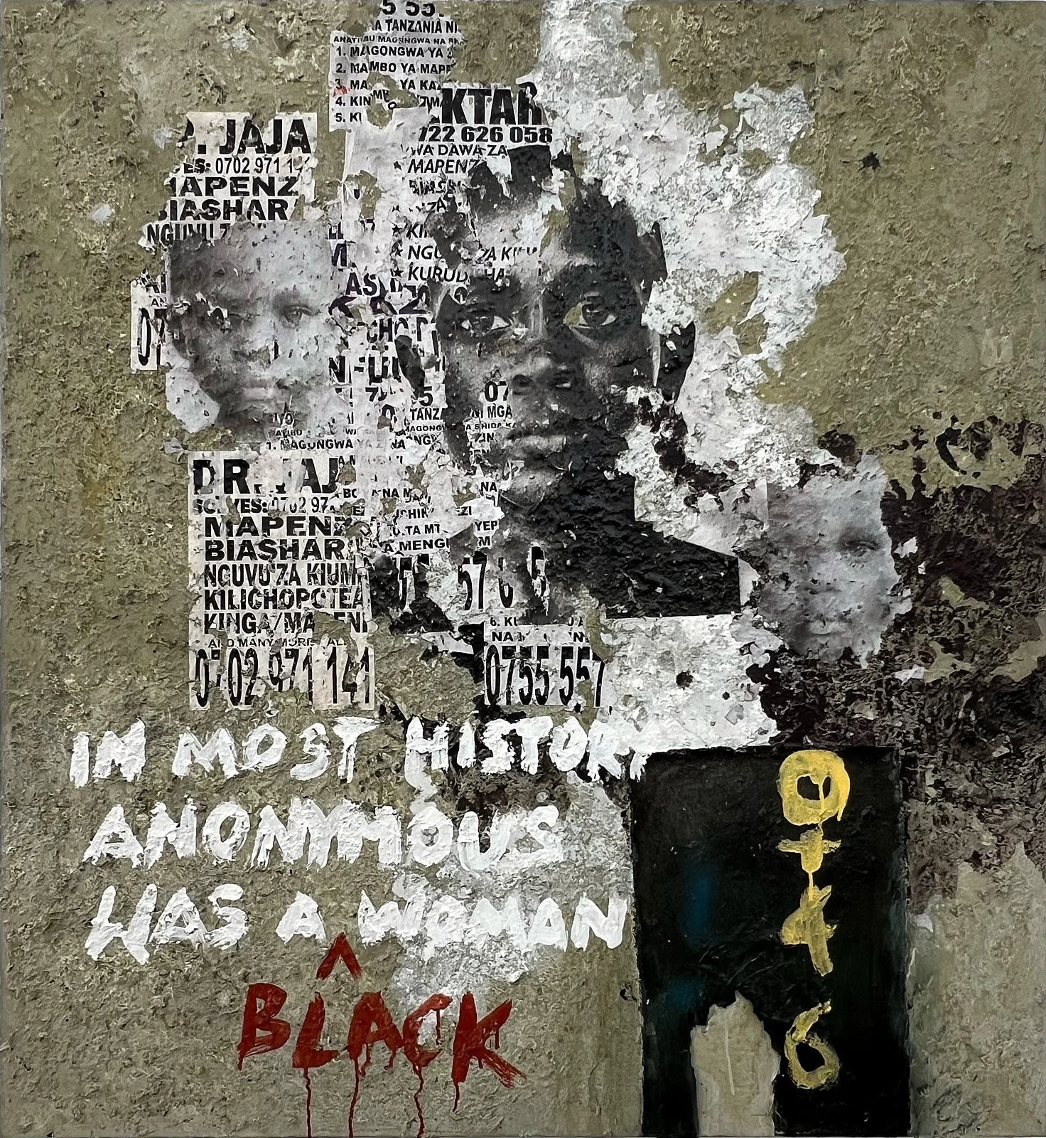 African Arts Trust. Artist strives to make social commentary incorporating commonly available advertising fliers into his work.