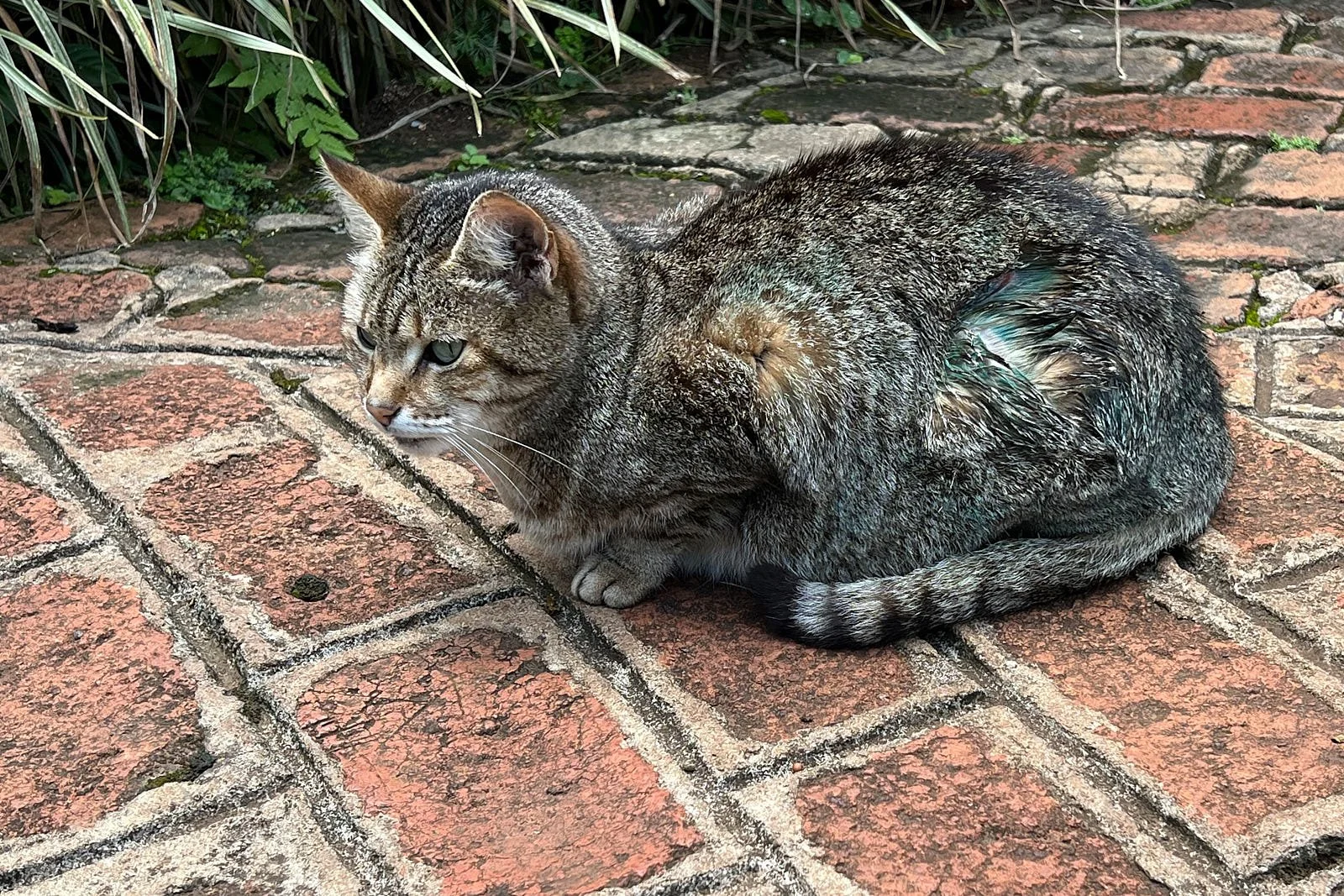 One Crowned Eagle parent swooped down to take kitty to their chick. The cat’s quick reflexes allowed it to escape capture but the eagle inflicted a deep wound in her flank.