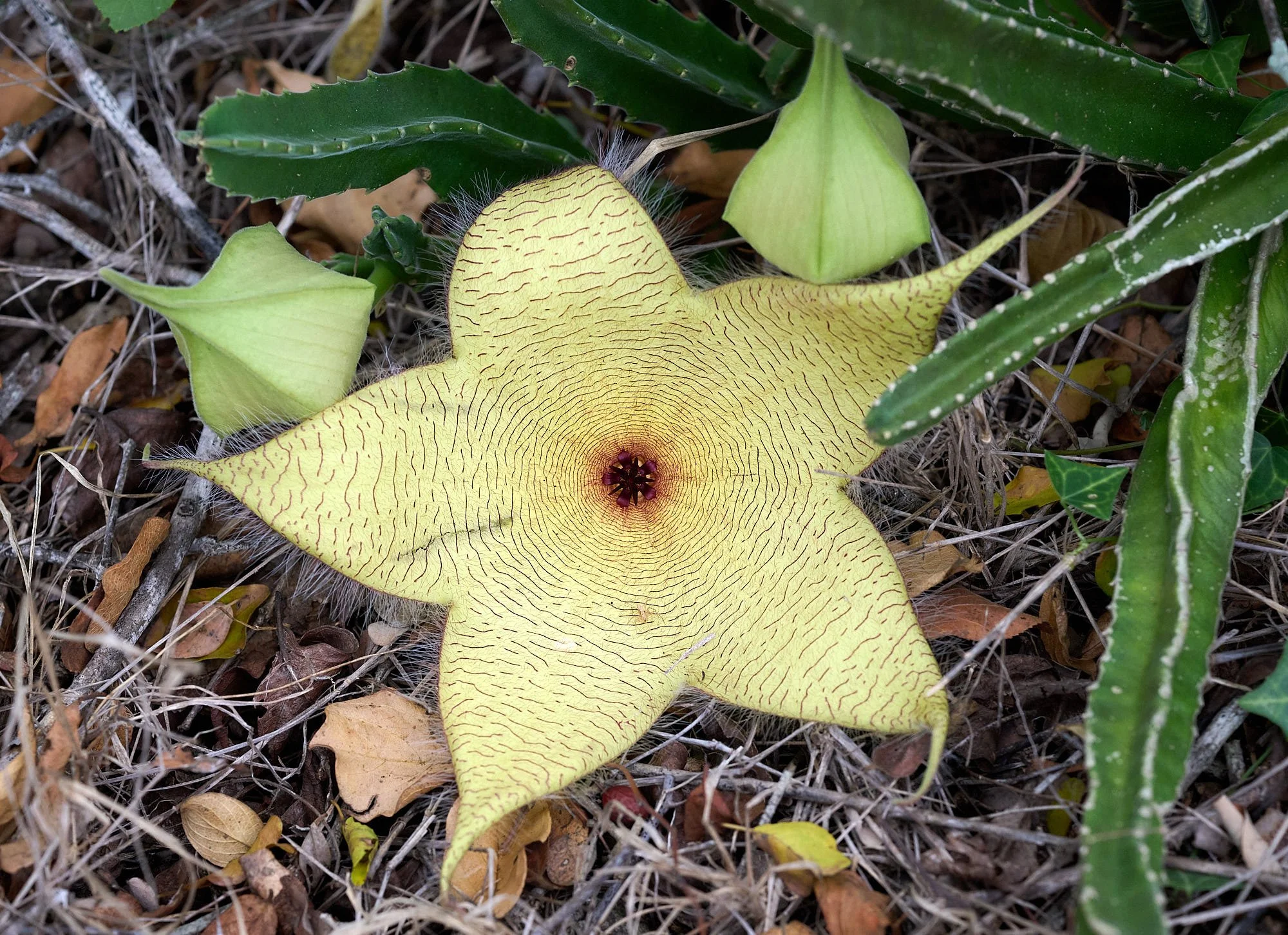 Stapelia gigantea. One of its common name is Carrion Flower - the flowers smell of rotten flesh and attract flies (pollinators).