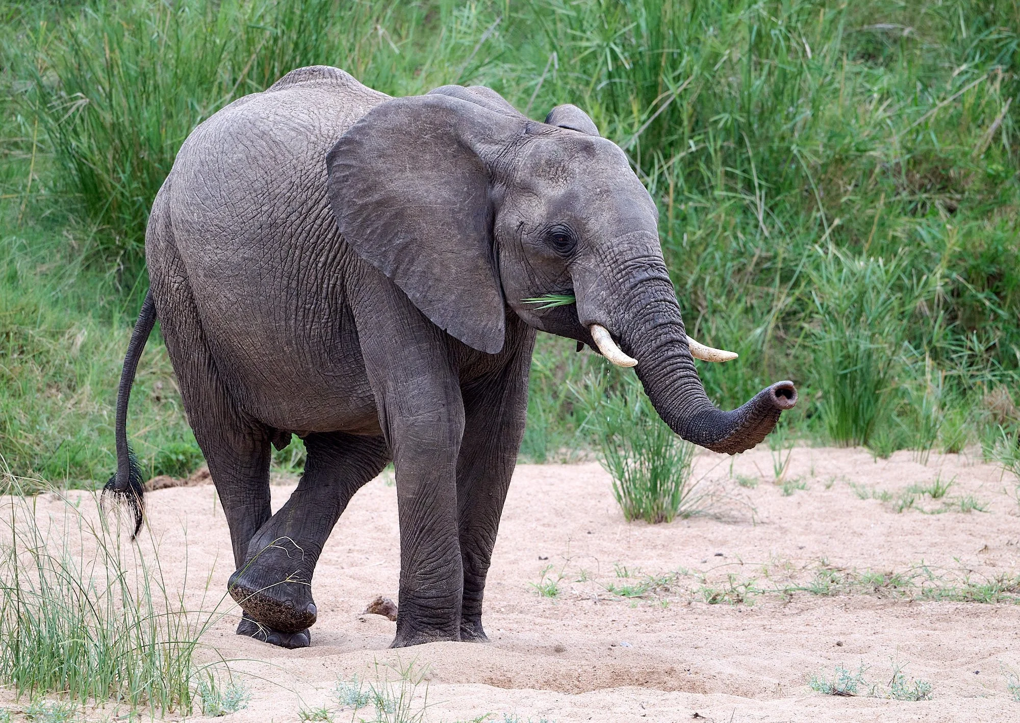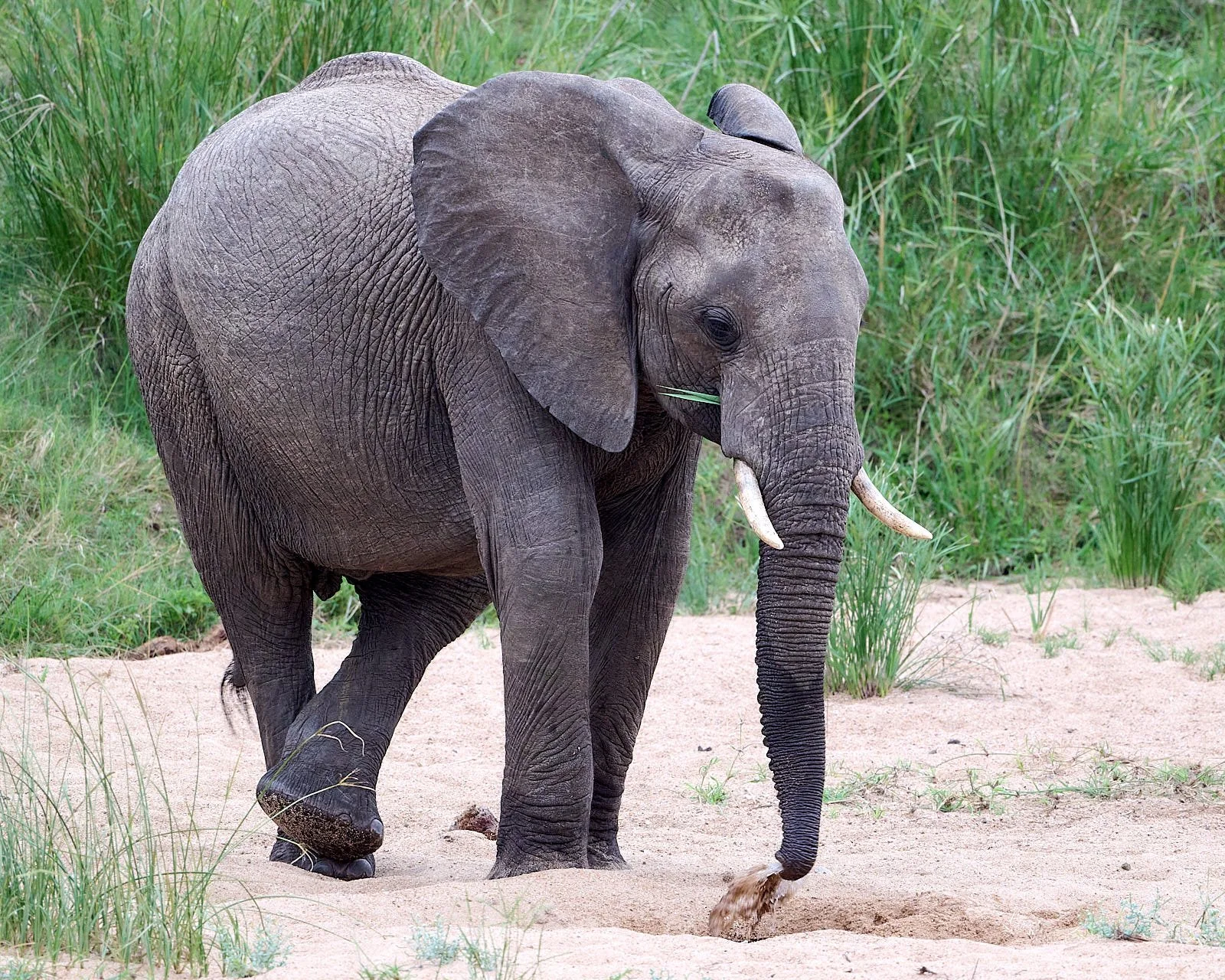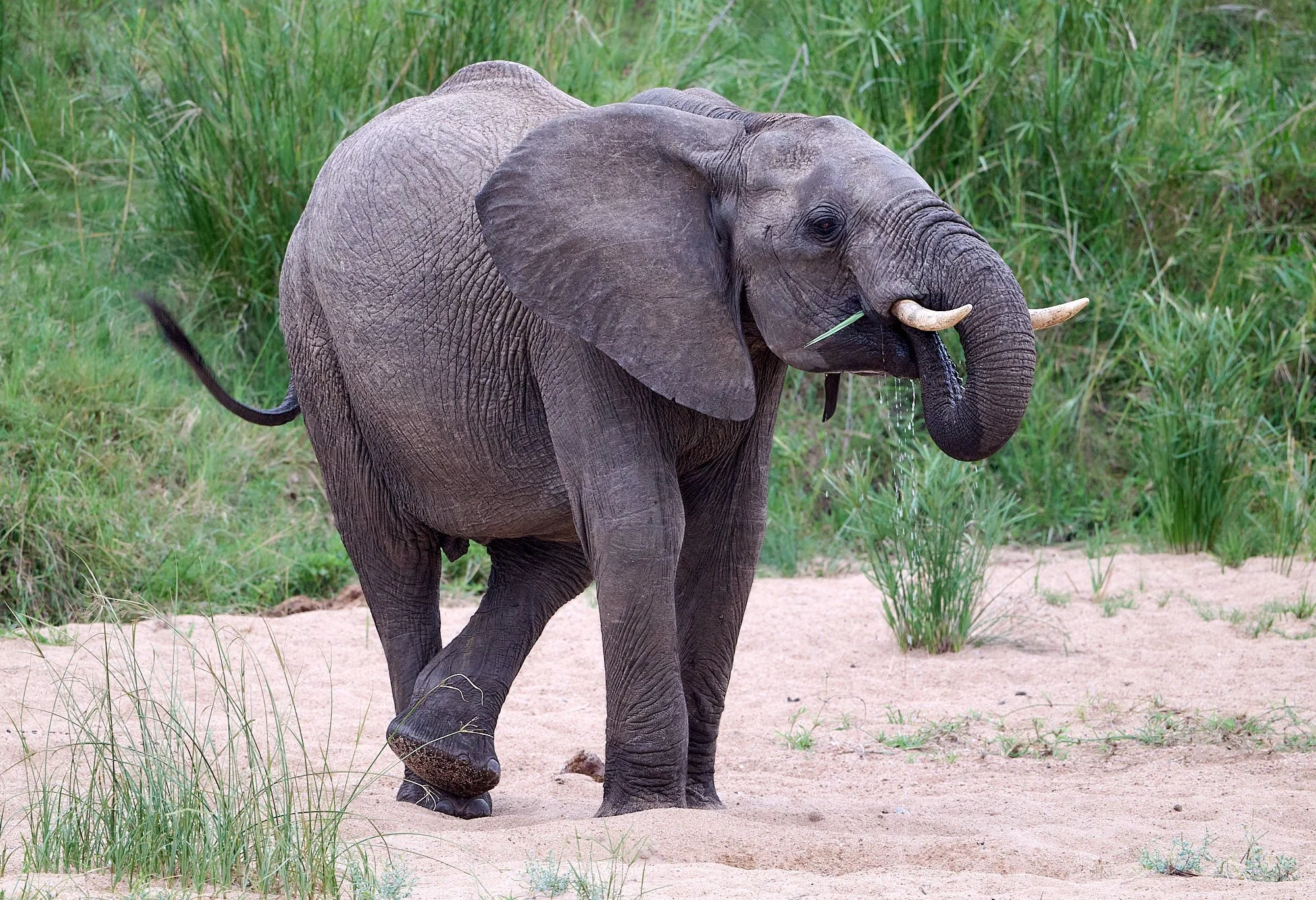 The Biyamiti river flows past camp. It is a small tributary and, during our visit, was reduced to a series of pools. This youngish male wandered down to drink at an elephant-excavated water hole. It was soon after sun down and the soft light was perfect.