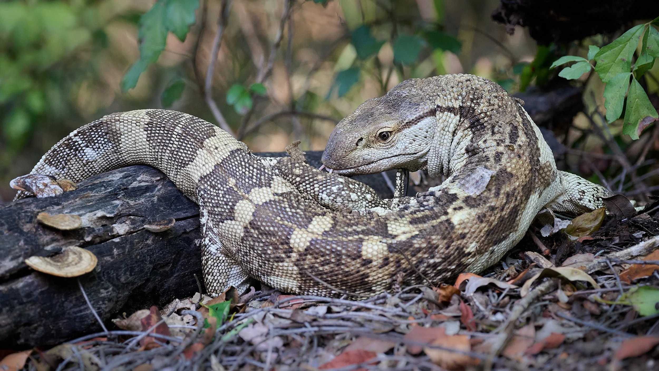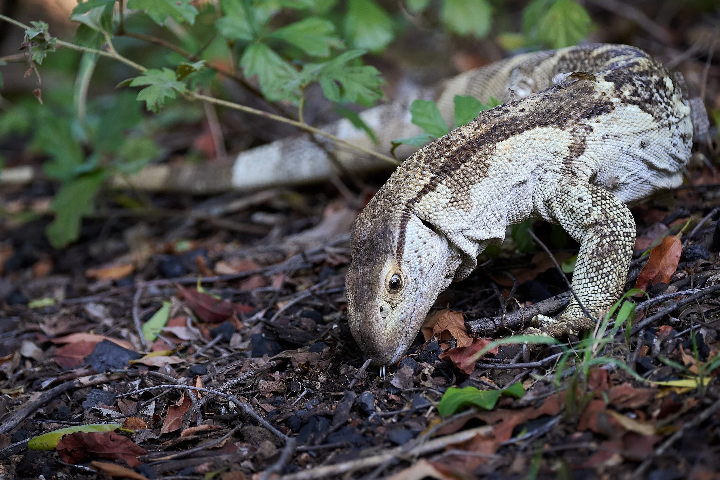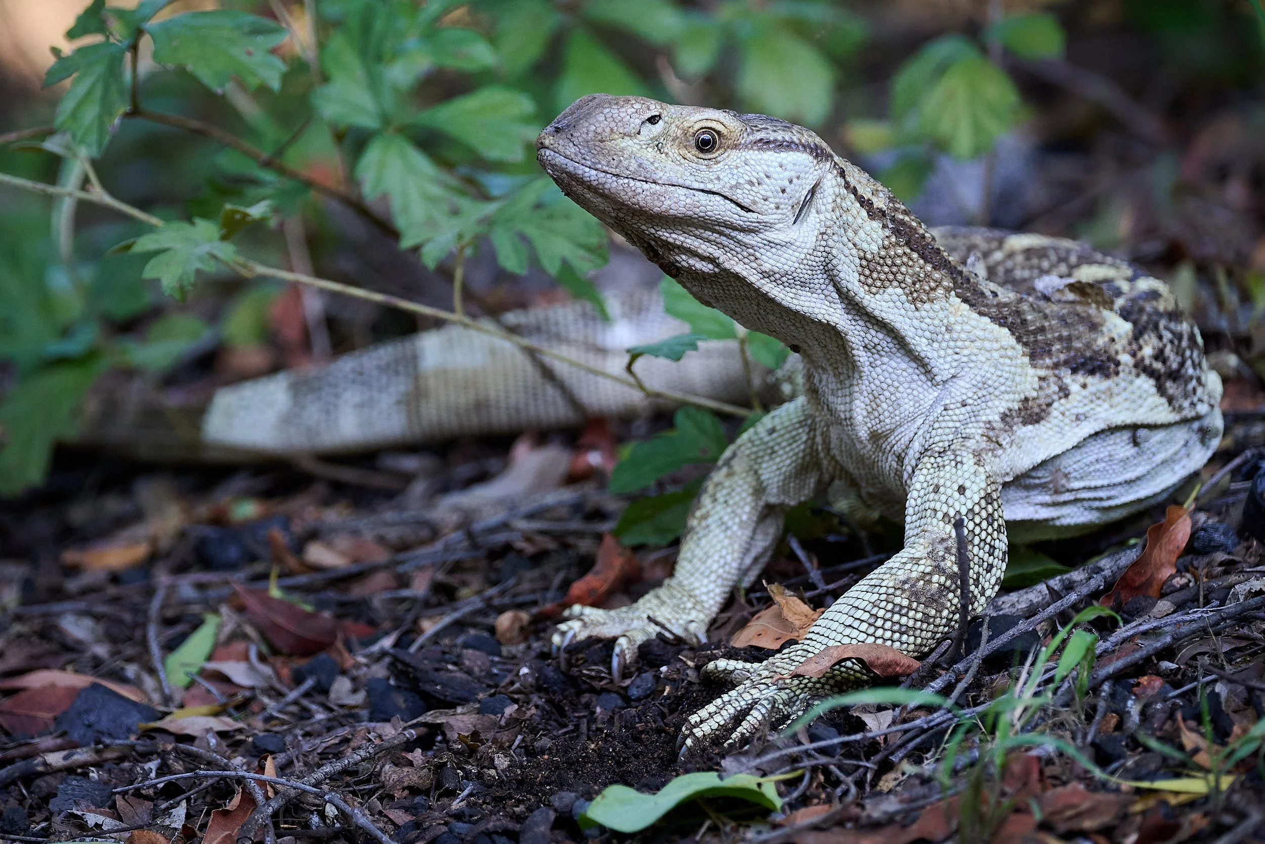 A rock monitor lizard patrolled the woodland undergrowth, looking for edibles.