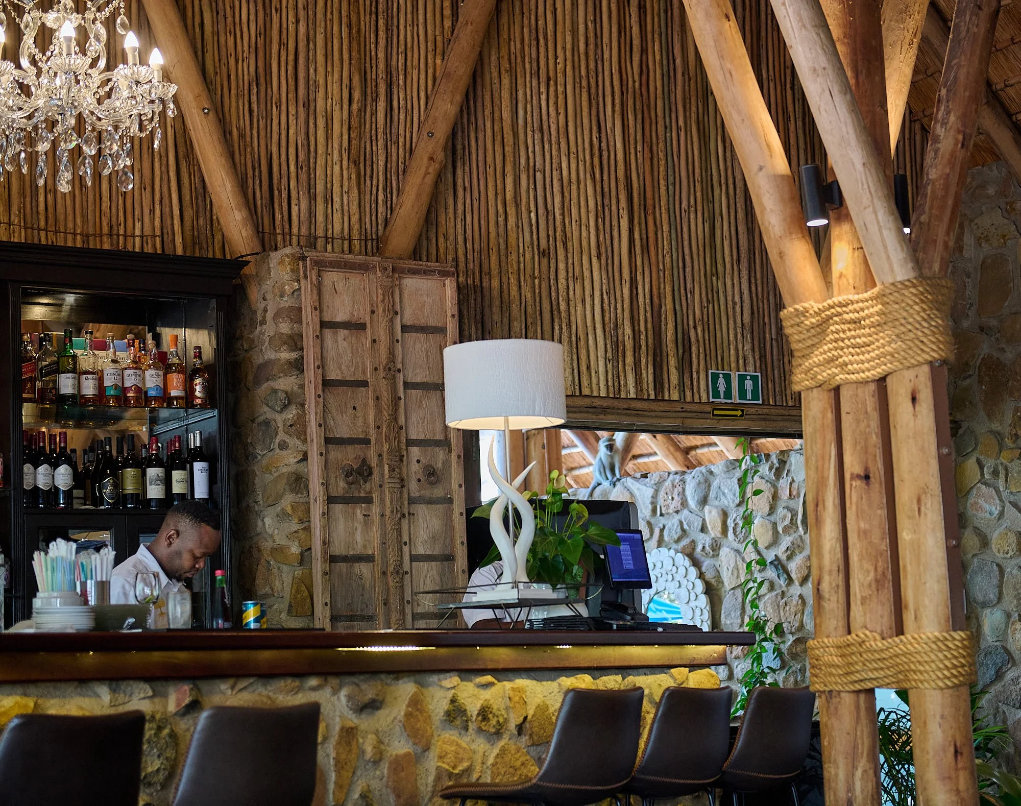 The Garden has a fancy restaurant. A little observer is hoping the barman will relax his vigilance.
