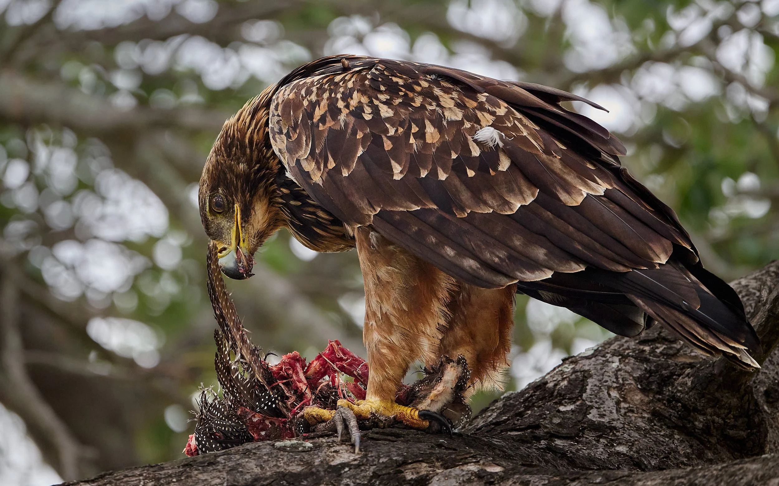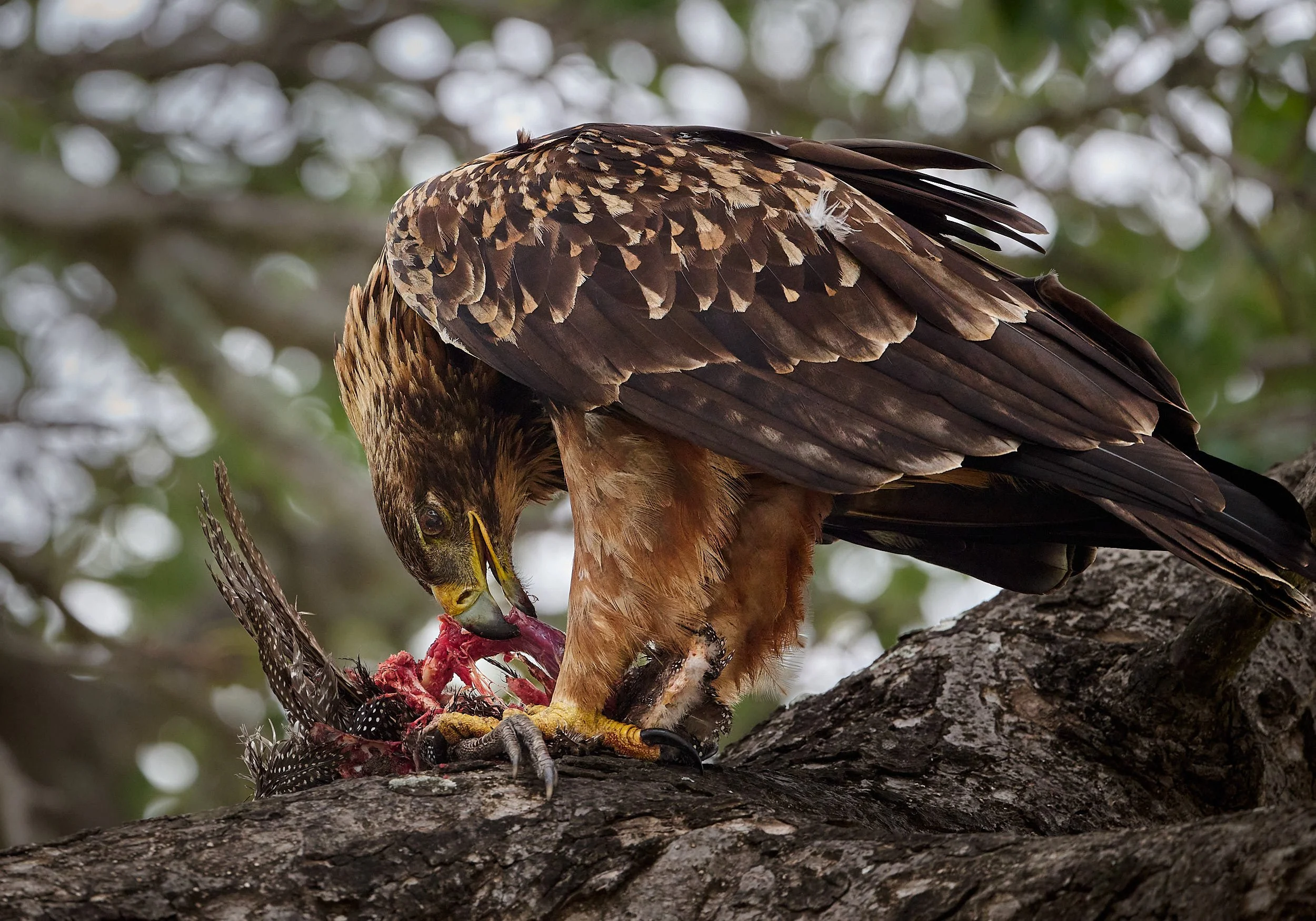 Pairs sometimes share kill at times other than the breeding season. This male has a distended crop and is wiping his bill clean of blood. He has handed over his Helmeted Guineafowl meal to his mate.