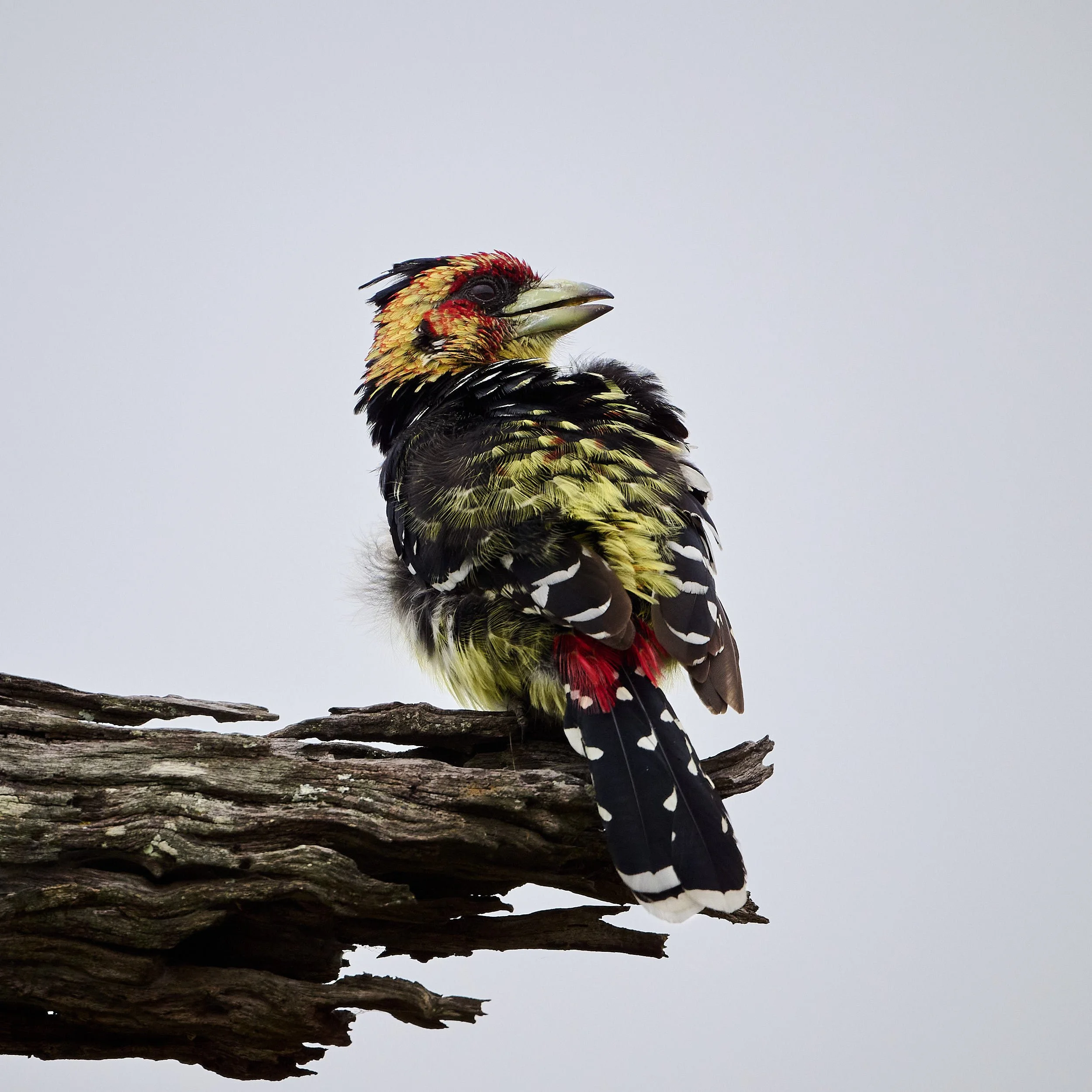 This individual was reacting with raised feathers and threatening pose to another Carmine that had landed nearby.