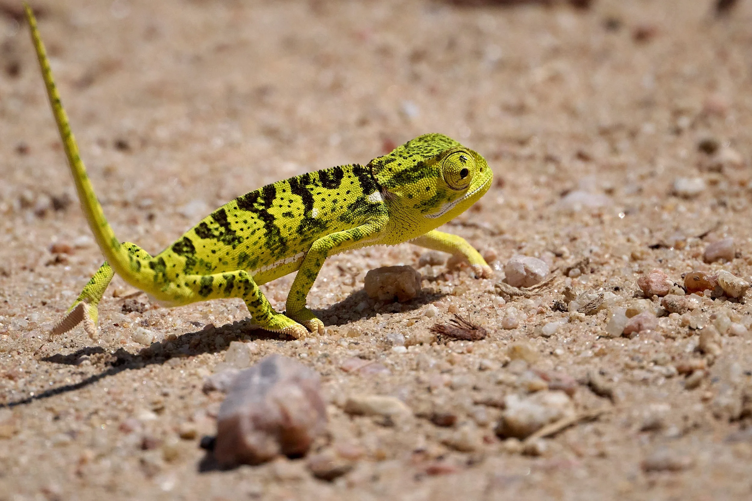 Chameleons are a highly specialized clade of Old World lizards of about 200 species. They often remain undetected because of their slow movement and ability to change color to match the background. Chameleons' eyes are independently mobile, and the chameleon’s brain is constantly analyzing two separate, individual images of its environment. When hunting prey, the eyes focus forward in coordination, affording the animal stereoscopic vision.