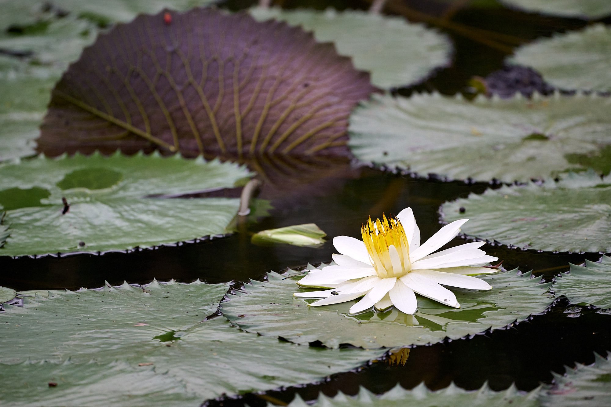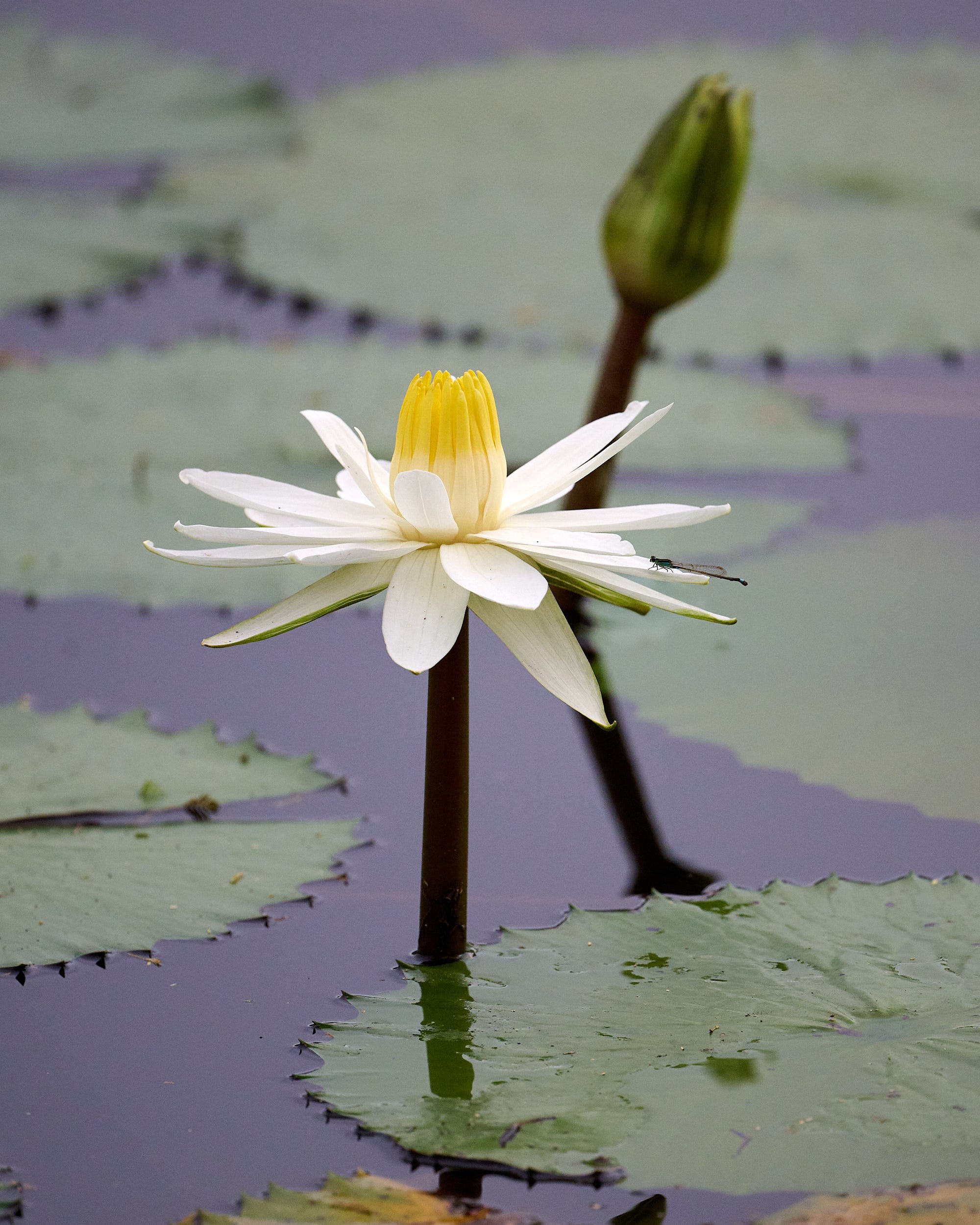 Nymphaea lotus, the white Egyptian lotus with damselfly on petal.