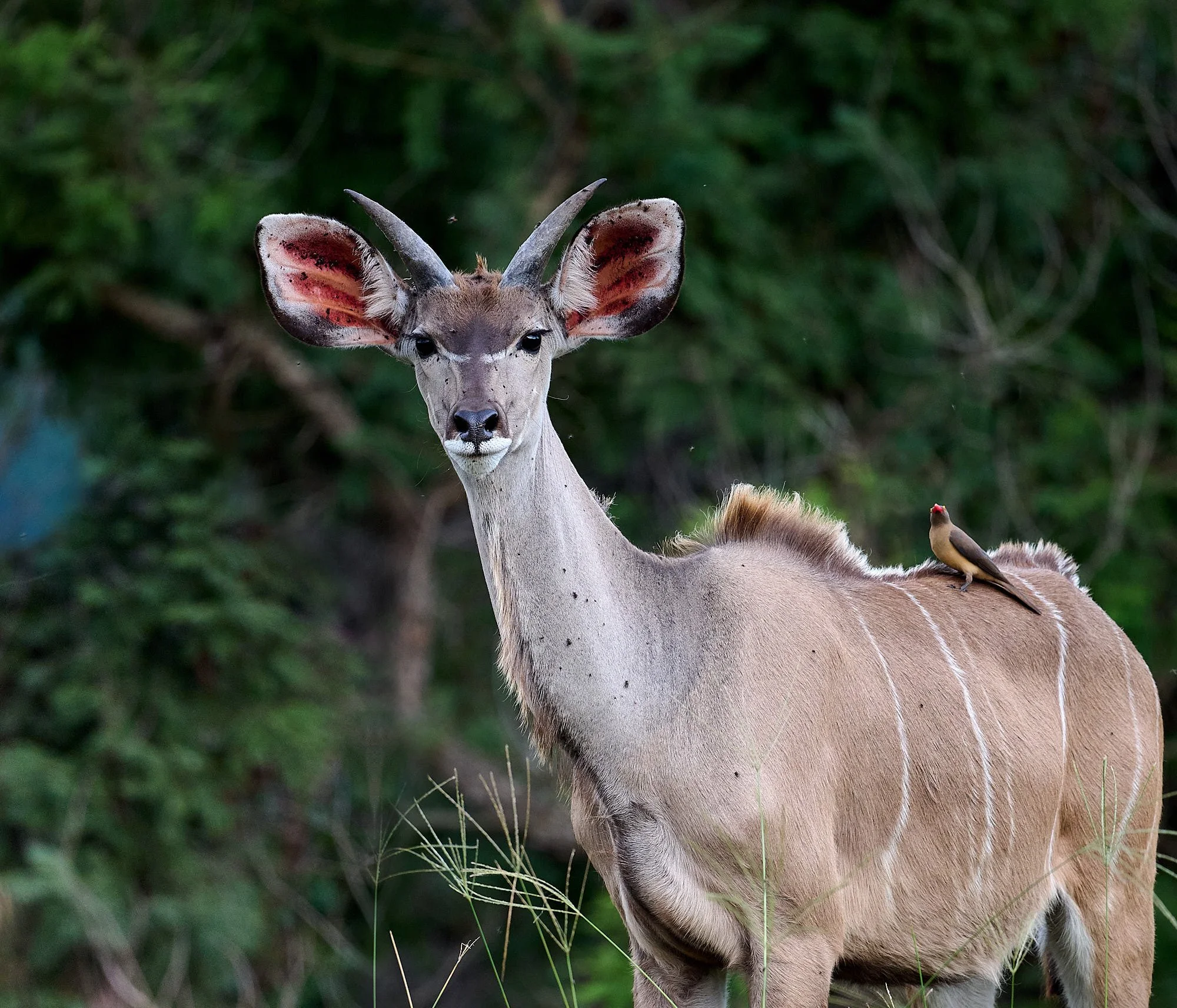 Red-billed oxpecker on young male greater kudu
