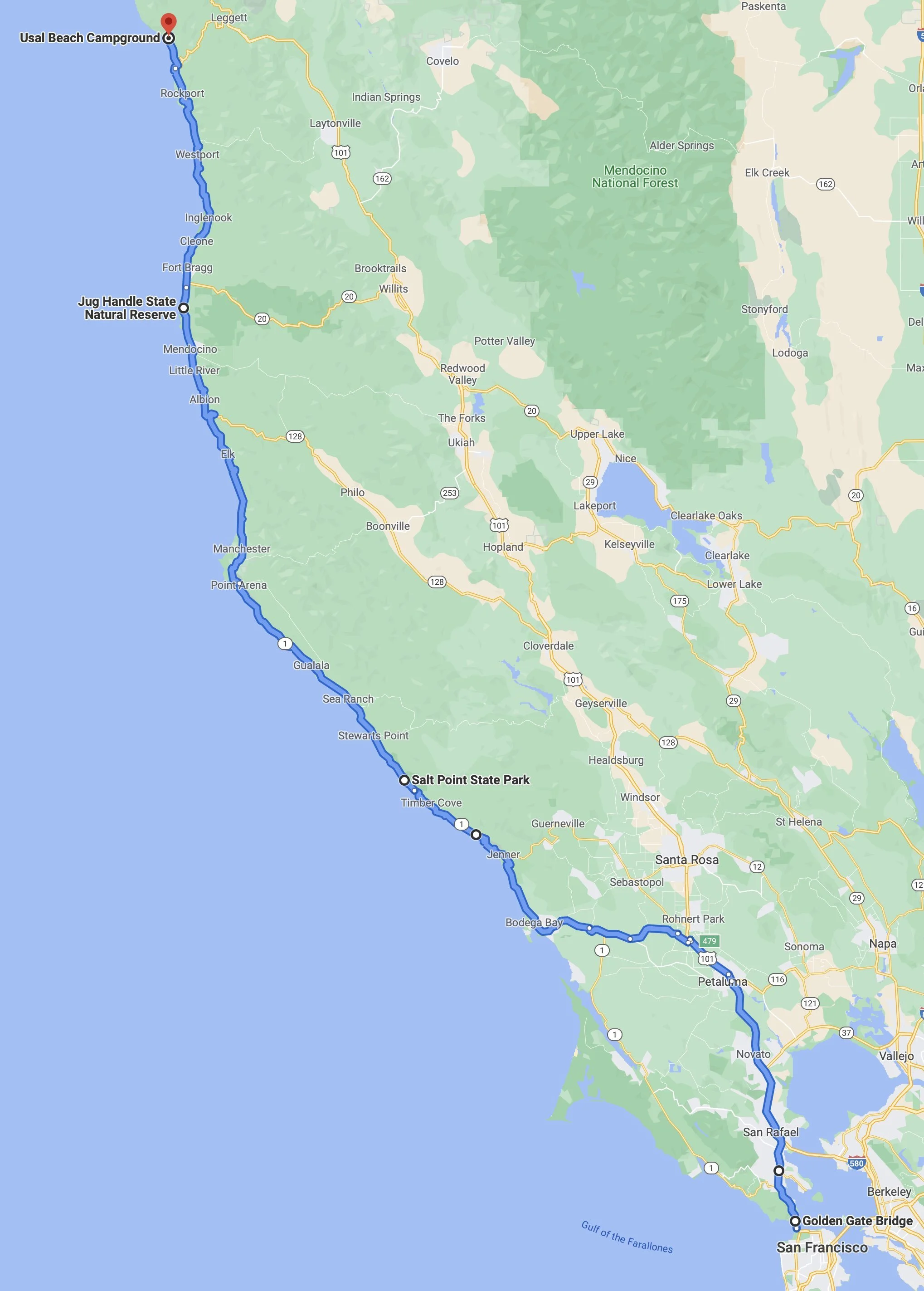 Usal Beach is a wonderful area. However, it has been badly trashed by the public. Don’t travel there on a weekend or holiday. The road requires cautious driving – lots of narrow blind corners. The Douglas trail is superb and the southern Lost Coast Trail looks a great multi-day hiking option, albeit quite strenuous.