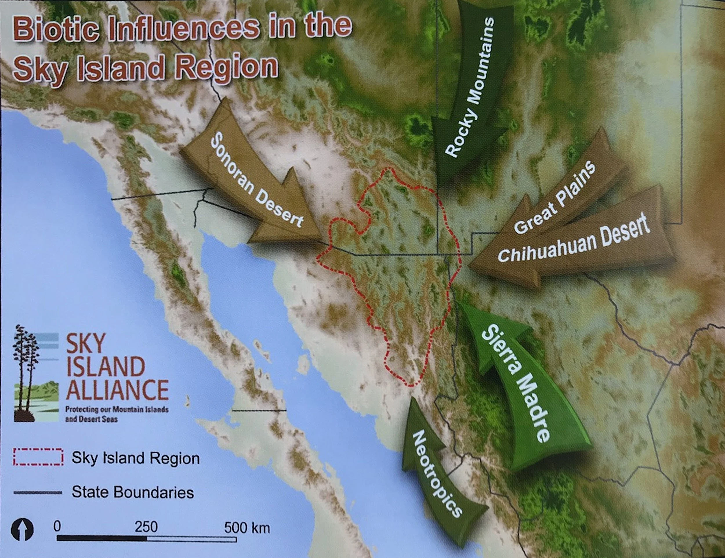 Sky Islands are isolated mountain ranges in southeastern Arizona and northern Mexico. The US portion of the Sky Island Region constitutes about 20,000 square miles. For every 1,000 feet gain in altitude, precipitation increases about 4.5 inches and temperature drops 4°F. Some of the mountains rise more than 6,000 feet above the surrounding desert floor making the lowlands and high peaks drastically different. The mountains offer relief from heat and thirst and provide additional options for nutrition and shelter. They act as biological “stepping stones” for montane species to disperse over time. Plants and animals living in the mountains could never survive in the surrounding deserts.