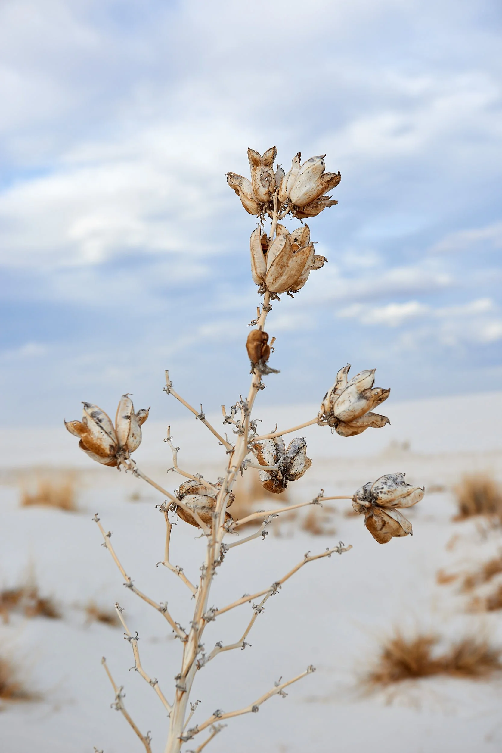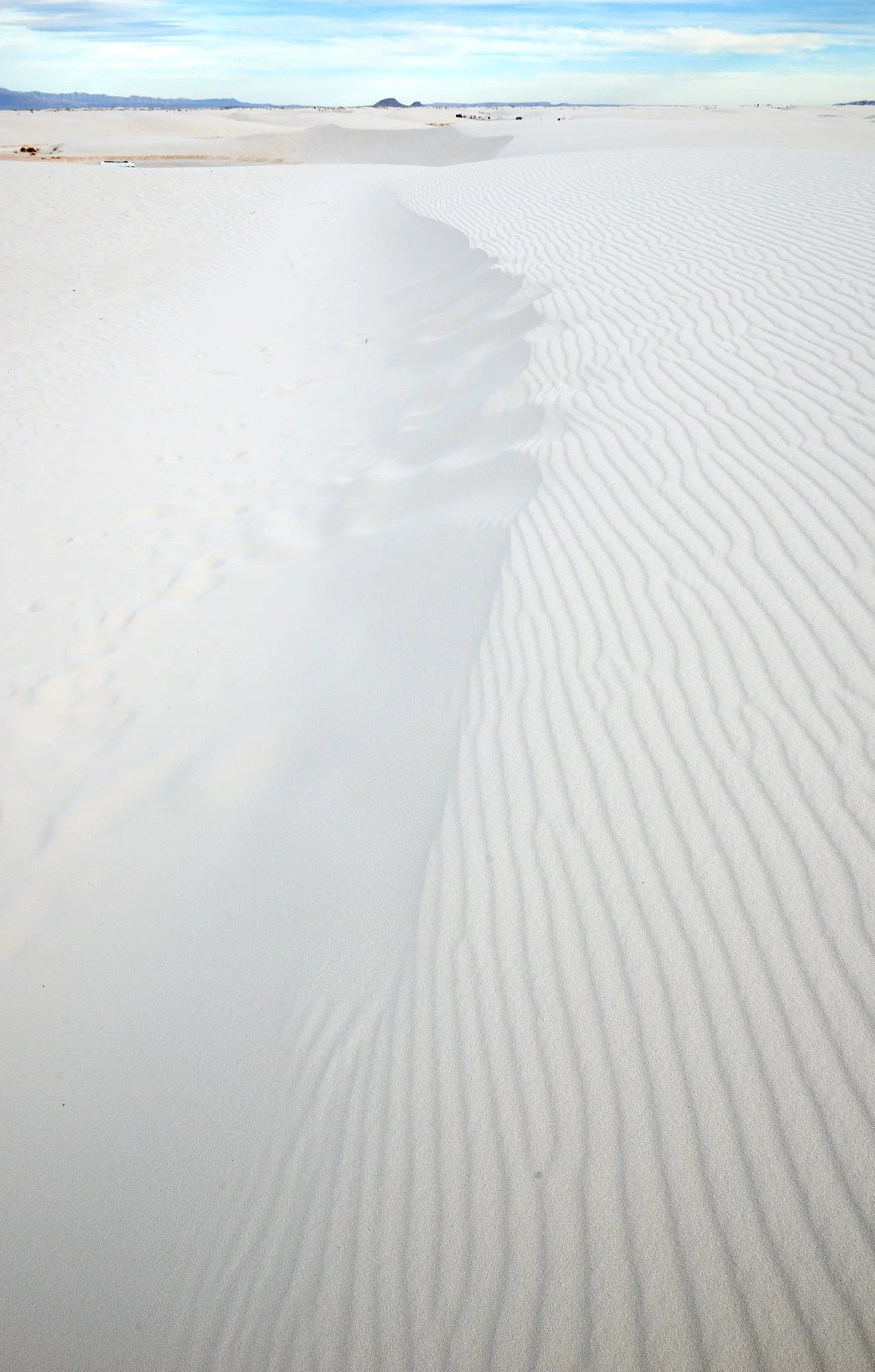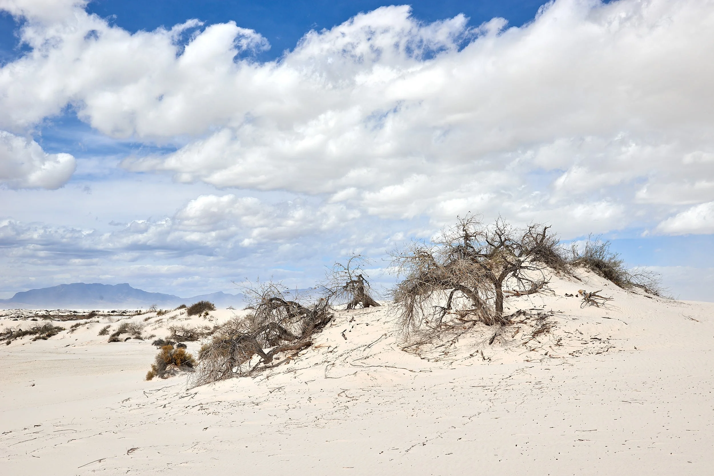 As the climate became warmer and drier, most of Lake Otero dried up. The dry portions of the lakebed became what we know today as Alkali Flat, while the smaller seasonal playa that remained formed modern Lake Lucero. As Lake Otero’s water disappeared gypsum crystals formed on Alkali Flat. The crystals (called selenite) are brittle and fragile. Strong northeast winds carried the smaller pieces, further breaking down the crystals into small grains and polishing them into a brilliant white color. The sand accumulated into today’s white dune fields.