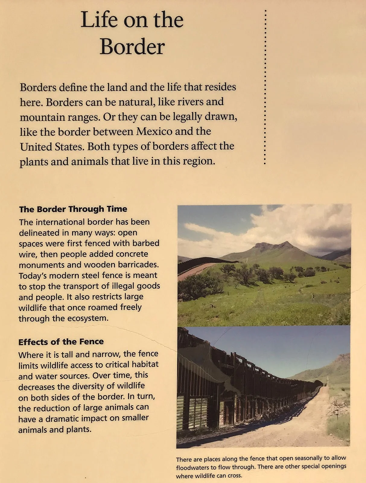 During our entire Southwest journey, we were probably no further than 80 miles from the US/Mexican border and quite often saw Border Patrol personnel. They told us that the border around Montezuma Pass was frequently used for crossings by undocumented migrants. Activity is monitored by high-tech equipment and local Patrol units.