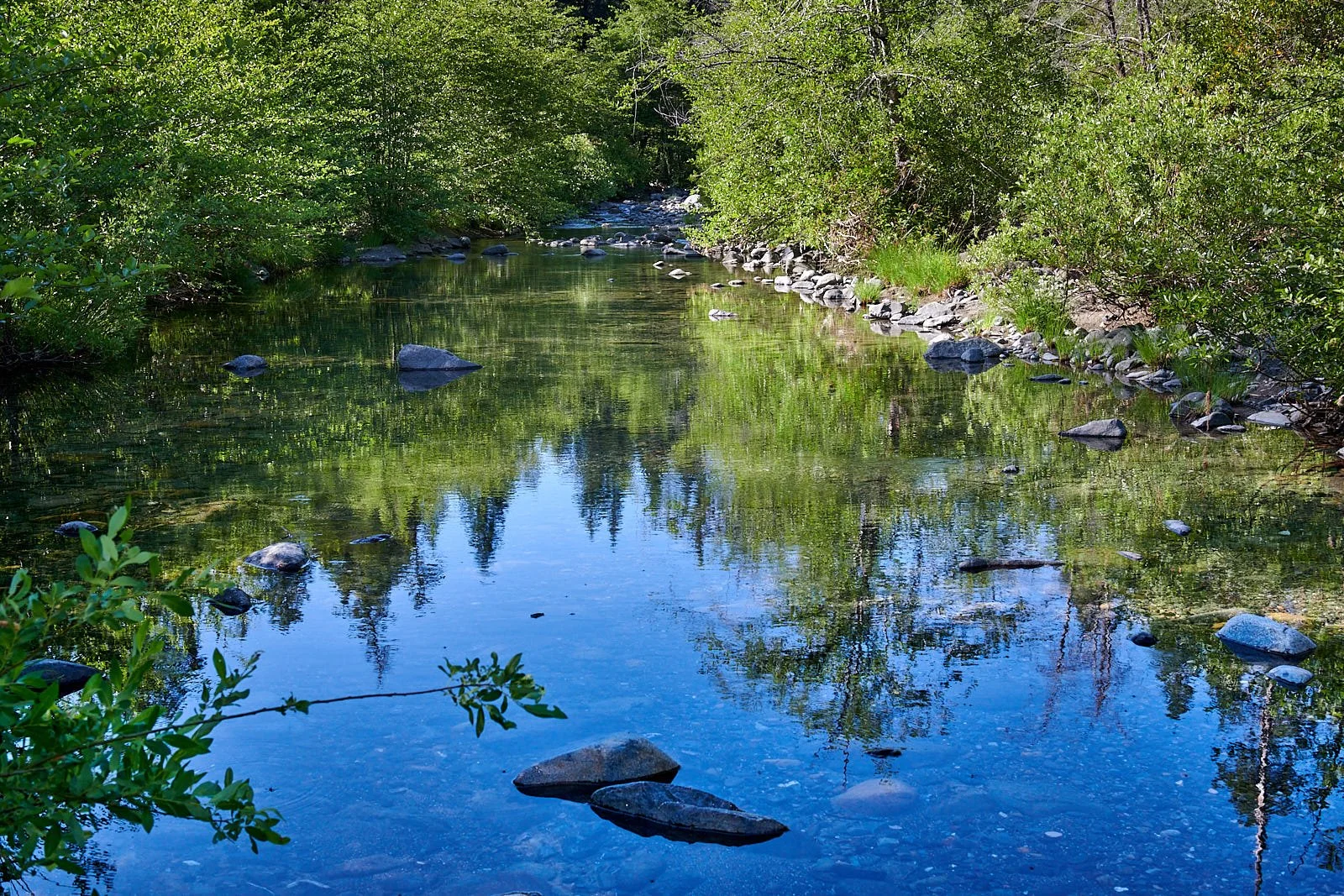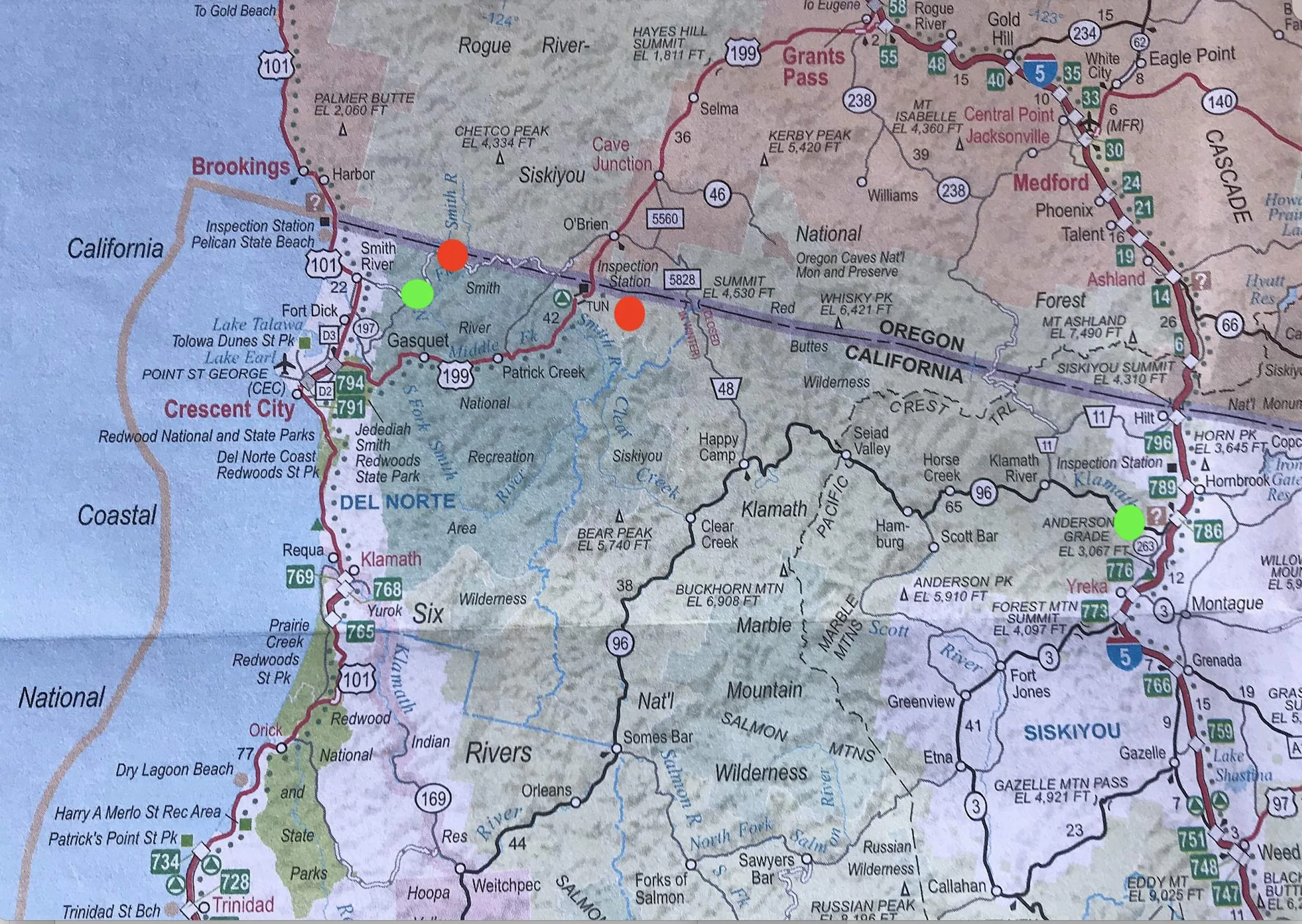 We entered the region via Interstate 5, turning west onto Highway 96 to reach Tree of Heaven campground alongside the Klamath River. At Happy Camp we drove north on Highway 48 into Oregon and then, at O’Brien, headed west again into California, following the energetic flow of the Smith River’s middle Fork.