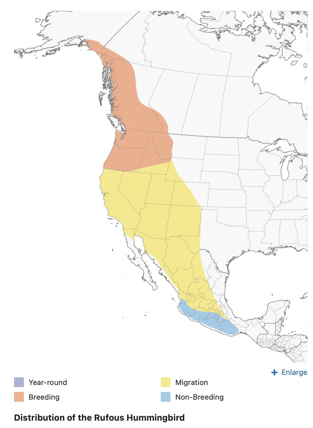 It is a complete migrant, vacating breeding grounds for wintering grounds primarily in Mexico. The species generally follows lowland coastal route north in spring, highland route (alpine meadows) south in summer/fall - tracking areas with most abundant flowers.