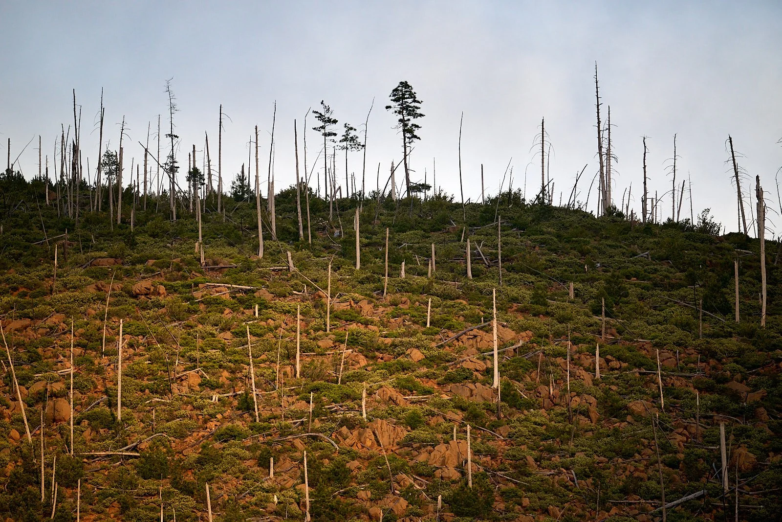 Early morning light penetrates coastal fog remnants to reveal burnt Jeffrey pines on an orange hillside of Josephine ophiolite.