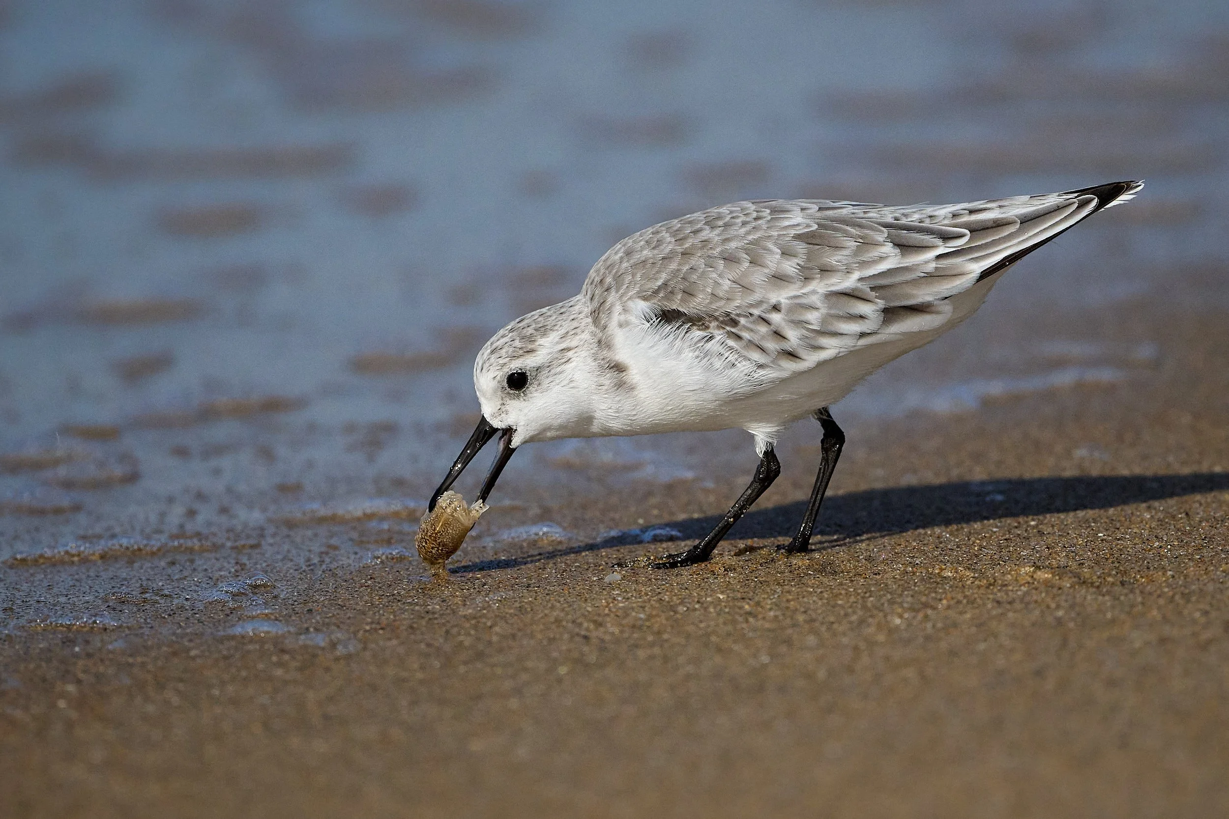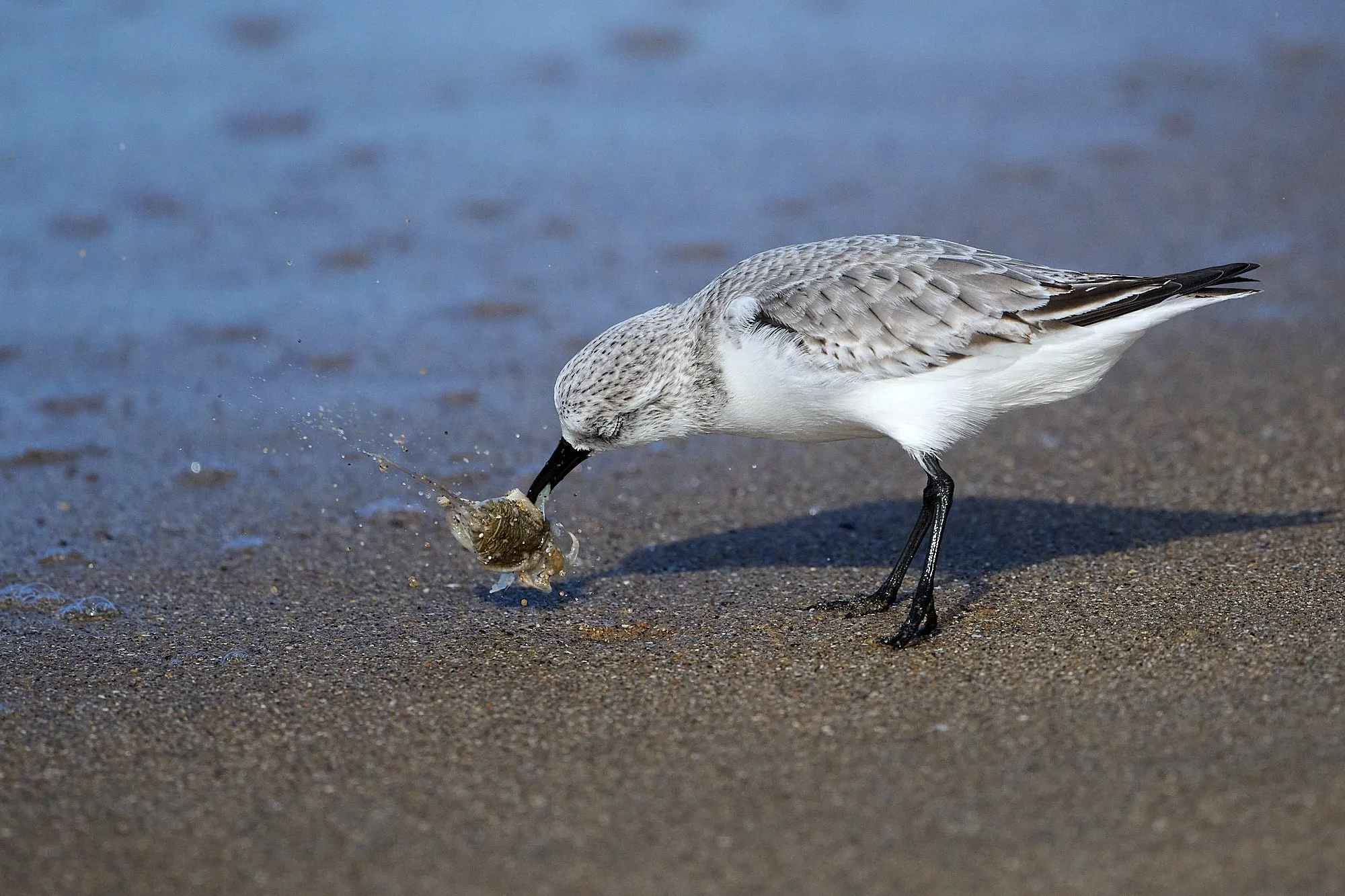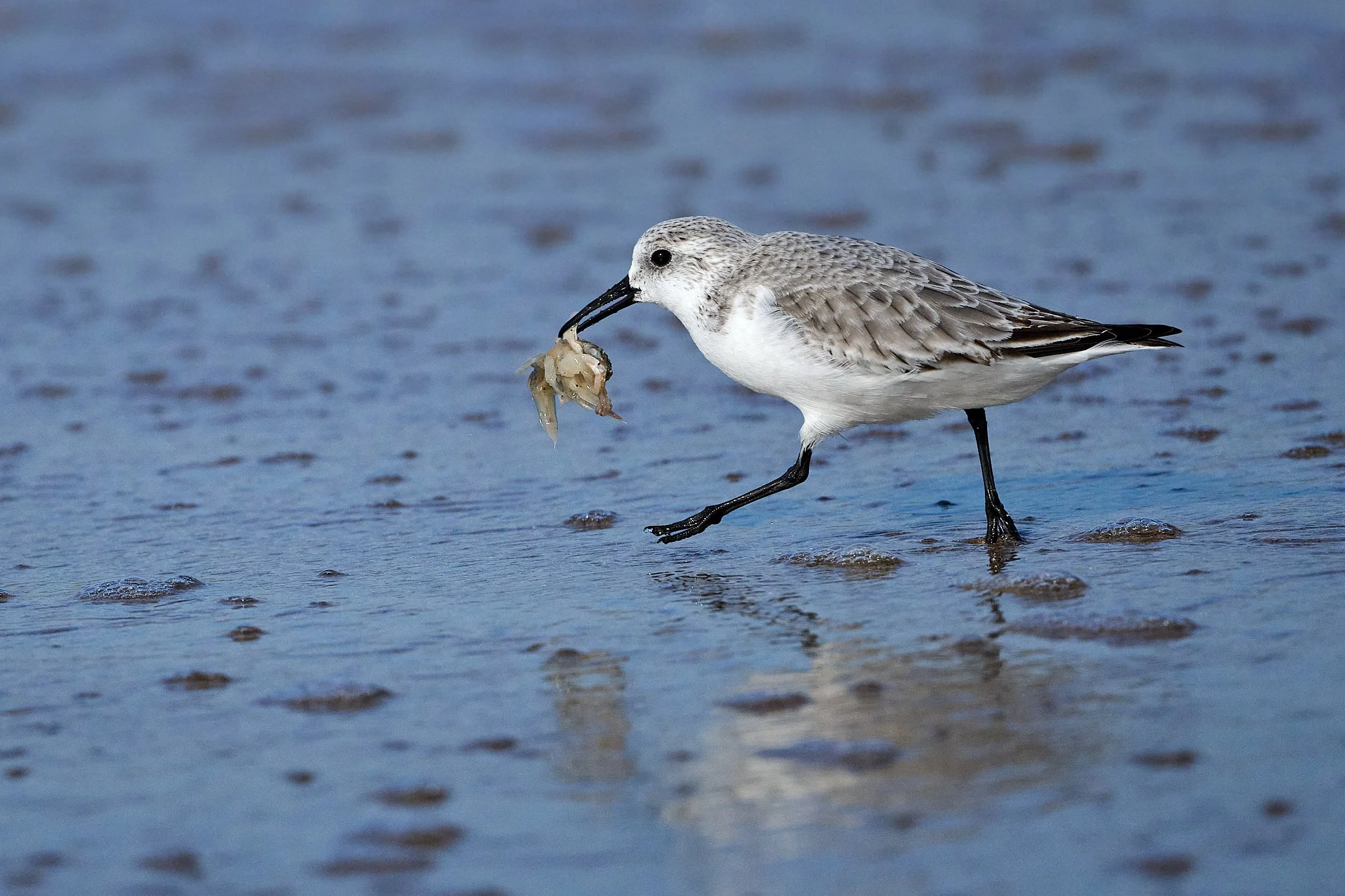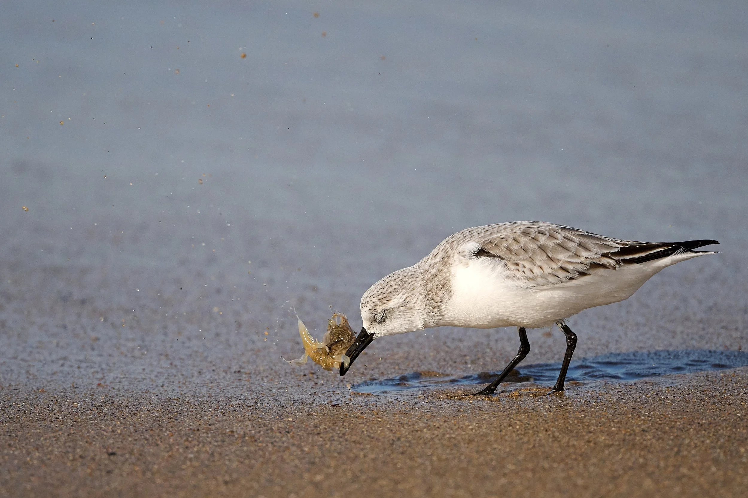 Sanderlings feed by picking and probing. On beaches, they run along tide line and, as a wave comes in, run up on the beach, just ahead of incoming wave, then run after receding wave, picking up crustaceans and mollusks stranded from outgoing water. They often probe and dig with their bills in wet sand and mud. While running, birds will skim food from shallow pools by dipping their bills into the water.
