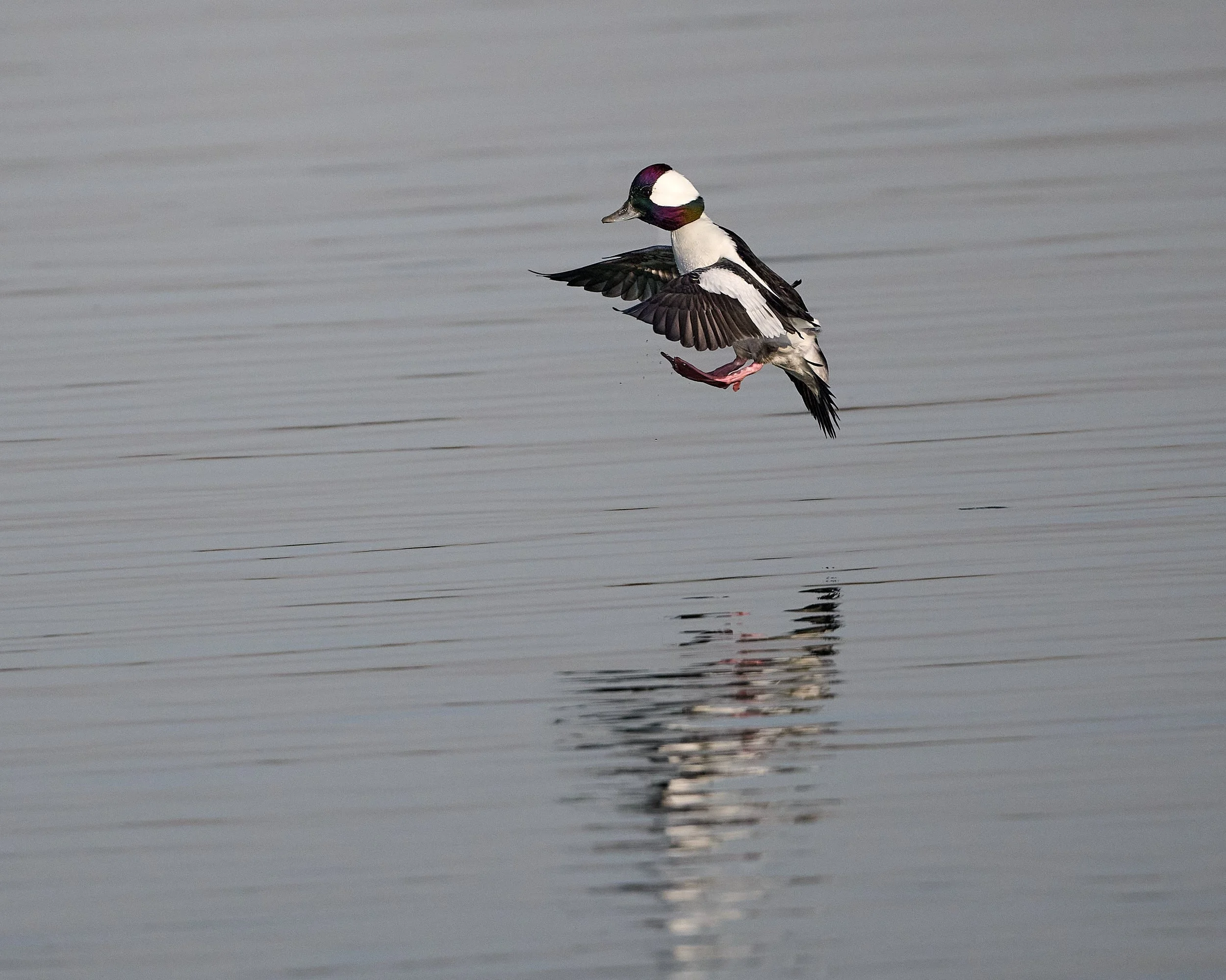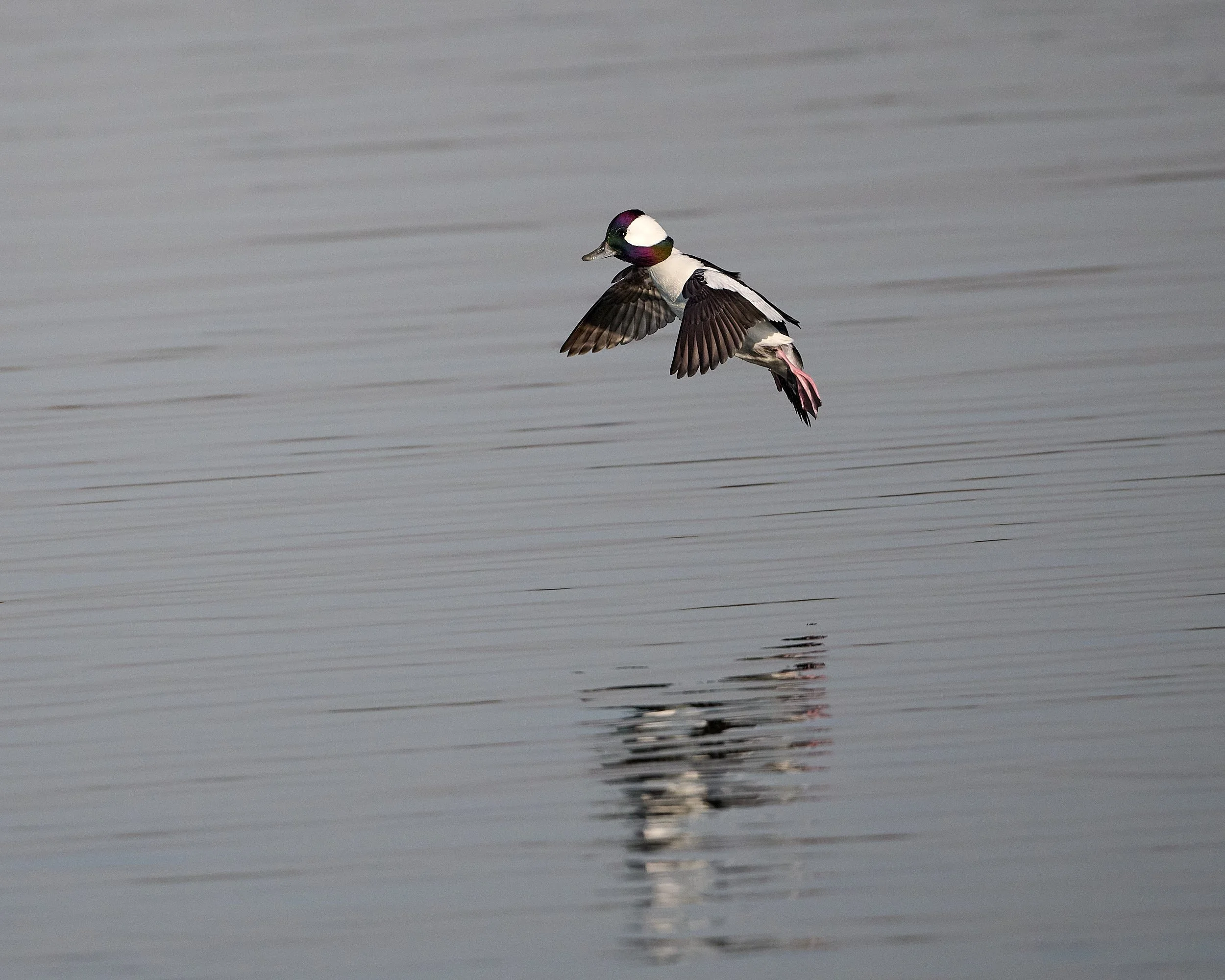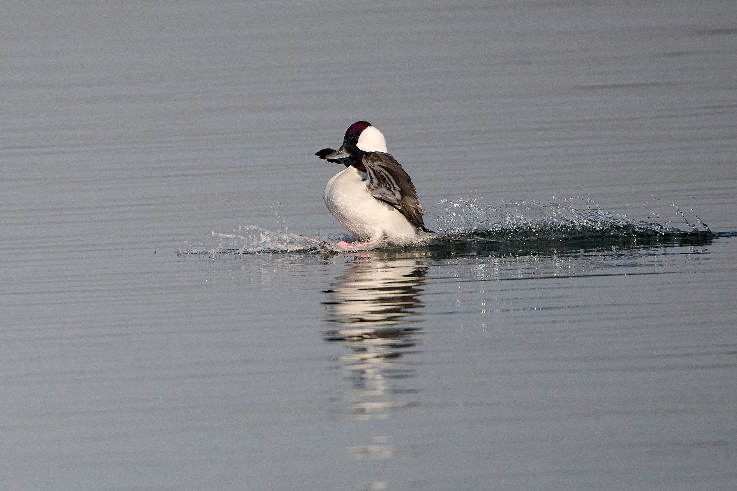 The Bufflehead, confined as a breeder to the boreal forest and aspen parkland of North America, is our smallest diving duck. Its small size has probably evolved with its habit of nesting in the holes of the Northern Flicker, an abundant resource too small to accommodate other, larger cavity-nesting ducks.